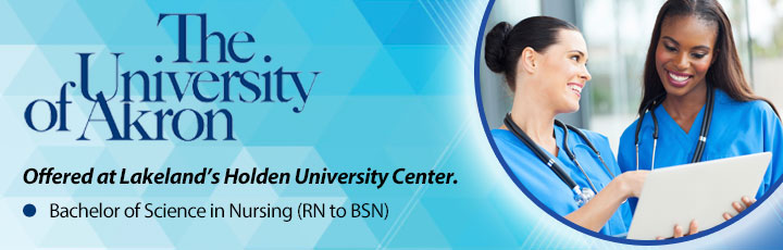 The University of Akron (UA) in partnership with Lakeland's Holden University Center offers convenient access to complete a Bachelor of Science in Nursing (BSN), right here in Lake County! The RN to BSN program is designed for the adult learner and learning builds upon prior knowledge and experience. The baccalaureate nursing program is approved by the Ohio Board of Nursing and is fully accredited by the Commission on Collegiate Nursing Education (CCNE).