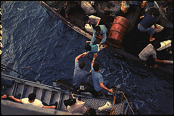 Crewmen of the amphibious cargo ship USS Durham (LKA-114) take Vietnamese refugees aboard a small craft.